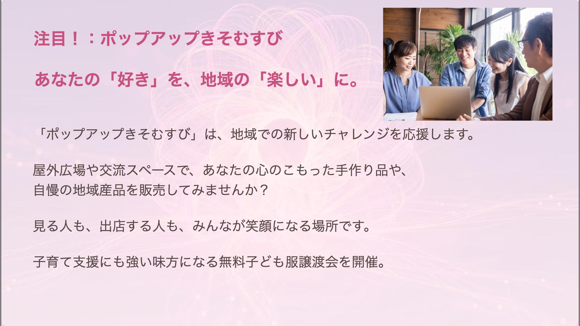 * ポップアップ出店:自分の得意なことを活かして出店・発表できる場を提供します。(出店1回:1,000円)