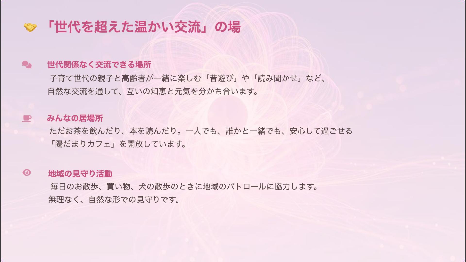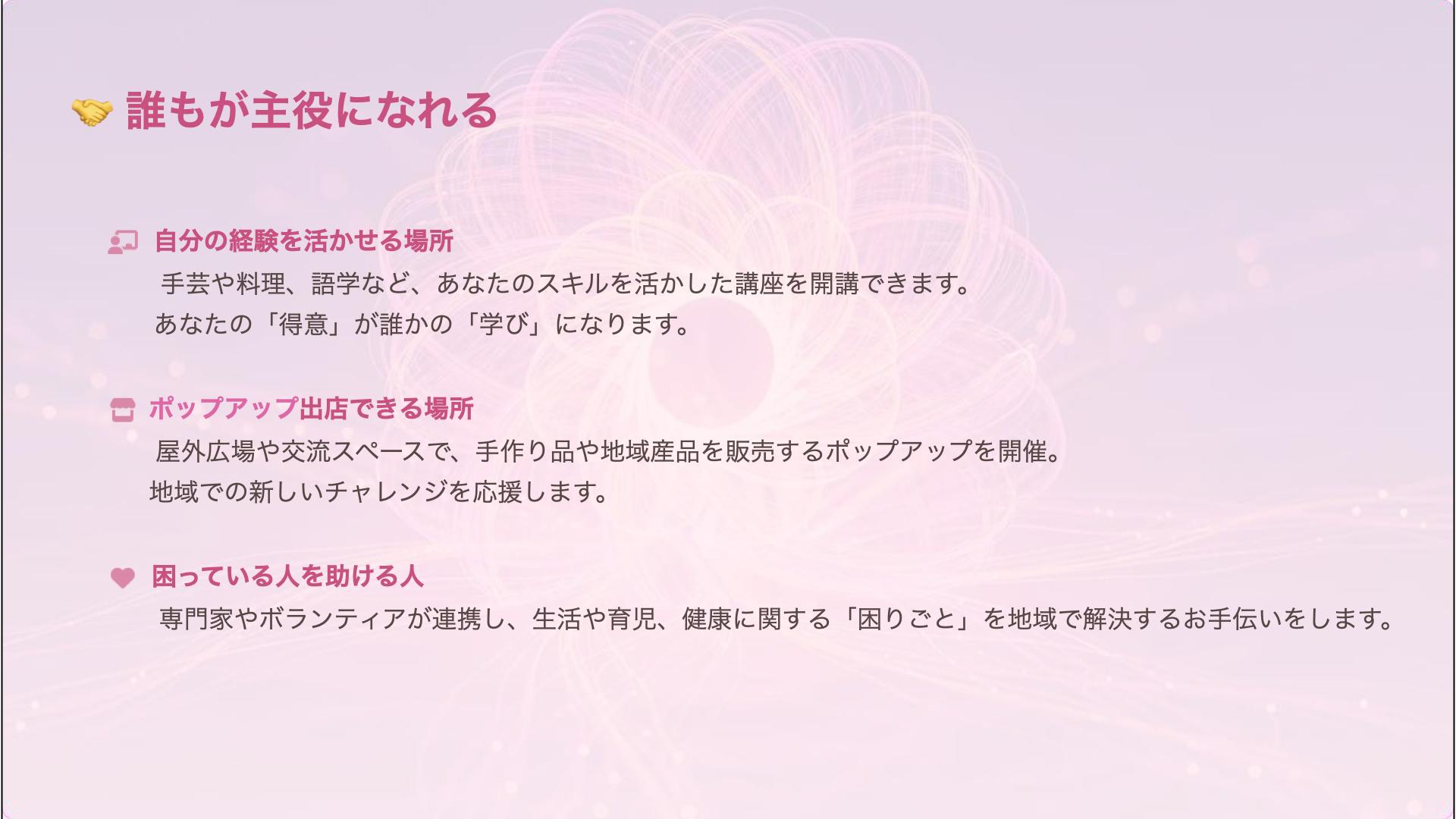 子どもの学びのサポート、地域のイベント企画、困りごと相談など、